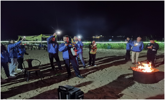 熱情跳躍的焰火驅散去一天的疲憊,隨著篝火的點燃,大家都爭先恐后表演起自己的拿手節目。大家情不自禁手拉著手,肩并肩圍著那紅彤彤的火焰,唱著歡快的歌、跳著歡快的舞,篝火晚會在一曲兔子舞中結束。
