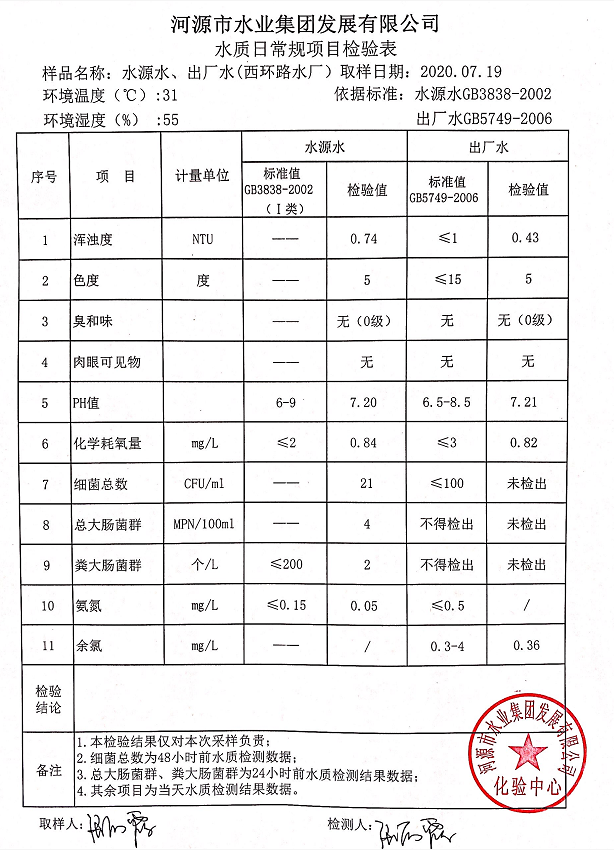 2020年7月19日水質檢驗報告