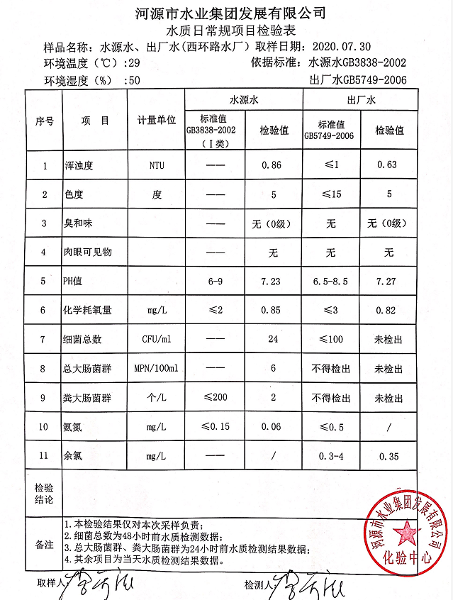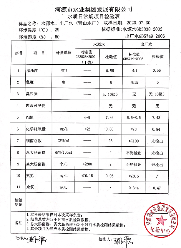 2020年7月30日水質檢驗報告