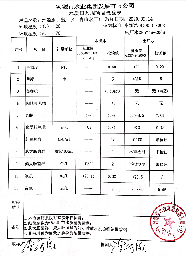 2020年9月14日水質檢驗報告