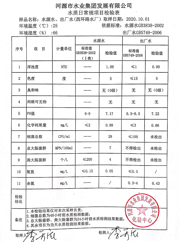 2020年10月1日水質(zhì)檢驗(yàn)報(bào)告