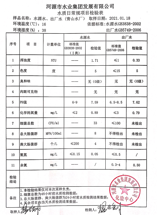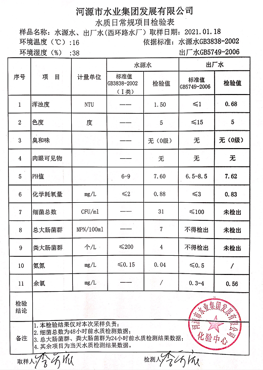 2021年1月18日水質(zhì)檢驗(yàn)報告