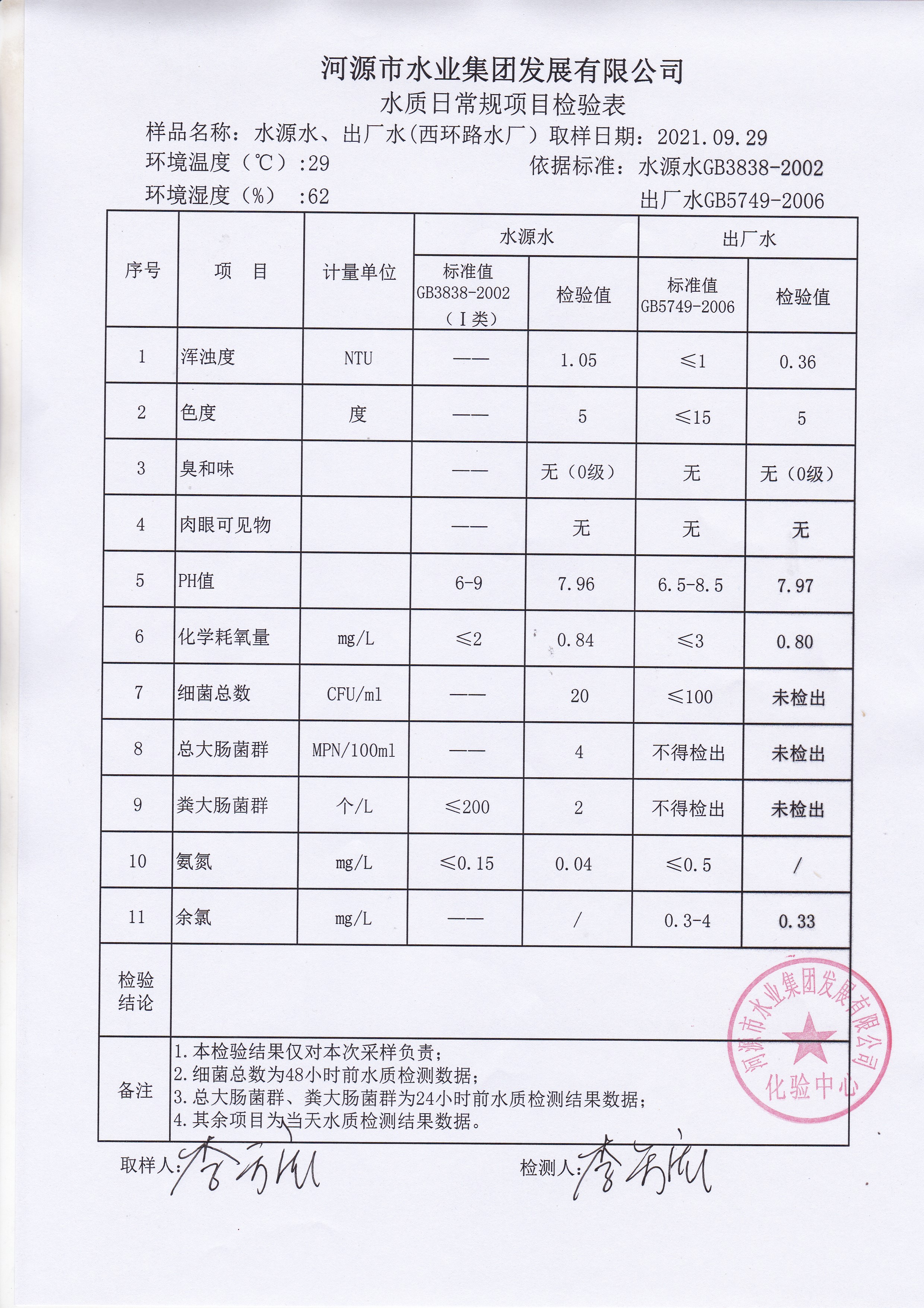2021年9月29日水質檢驗報告