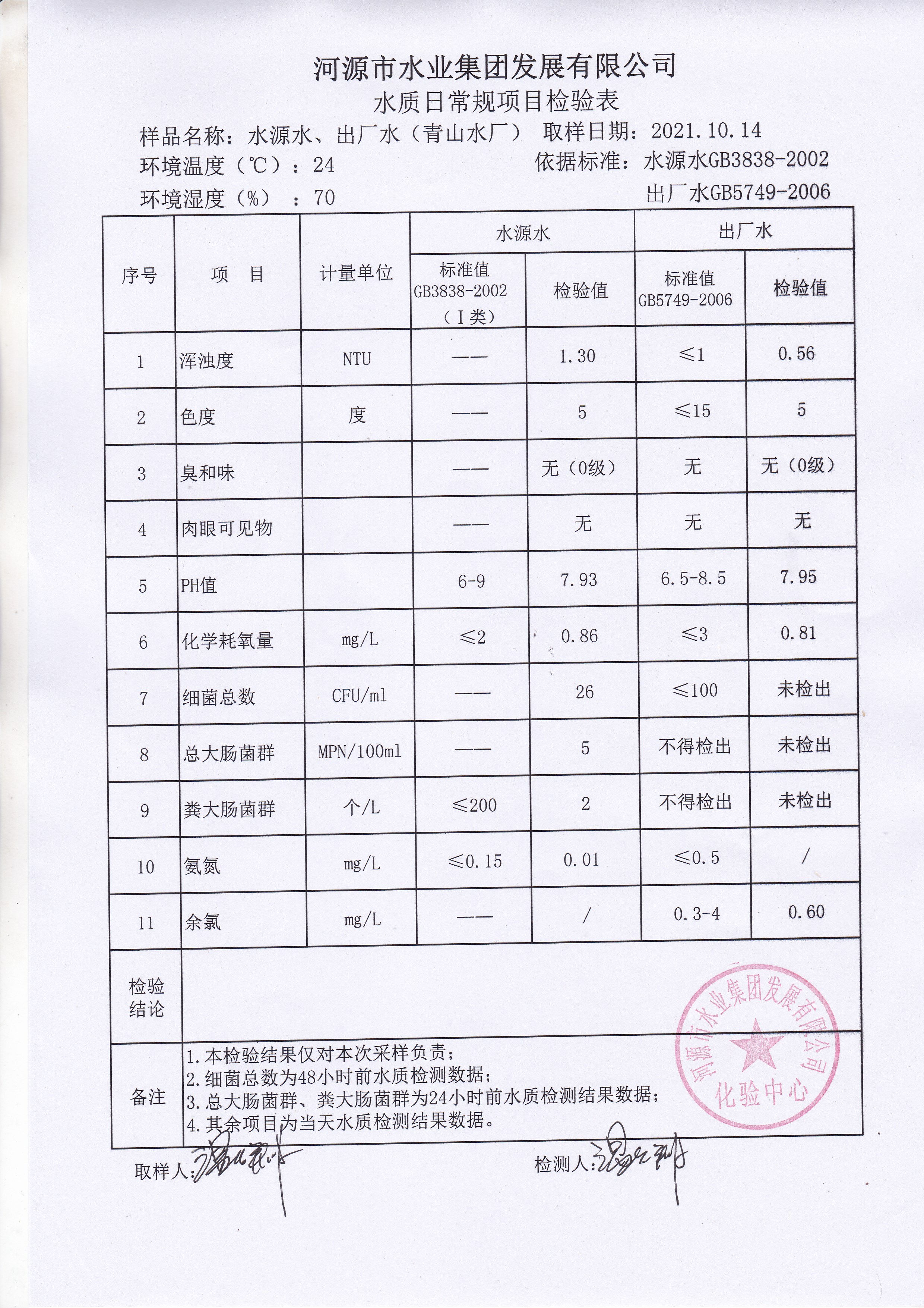 2021年10月14日水質檢驗報告