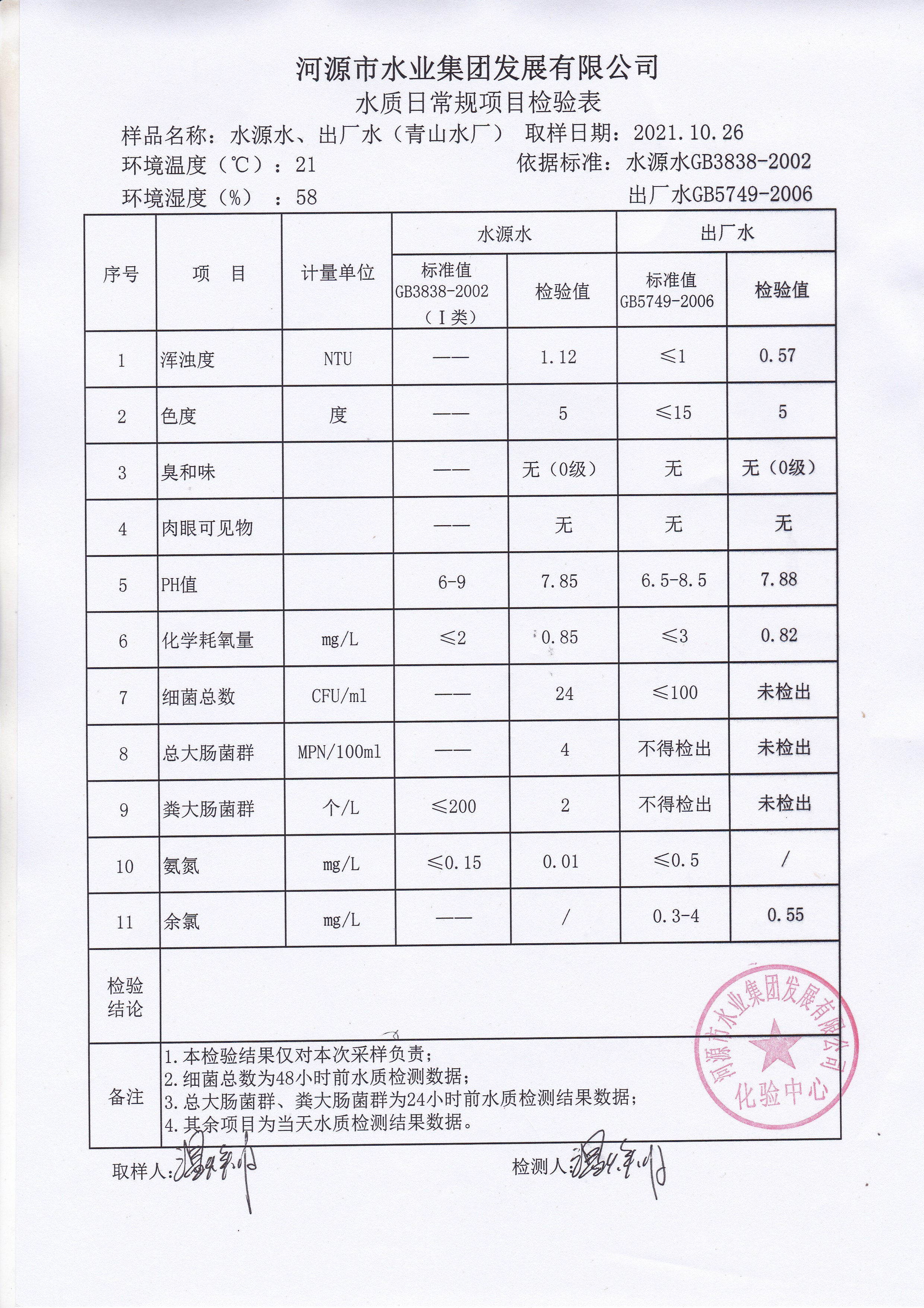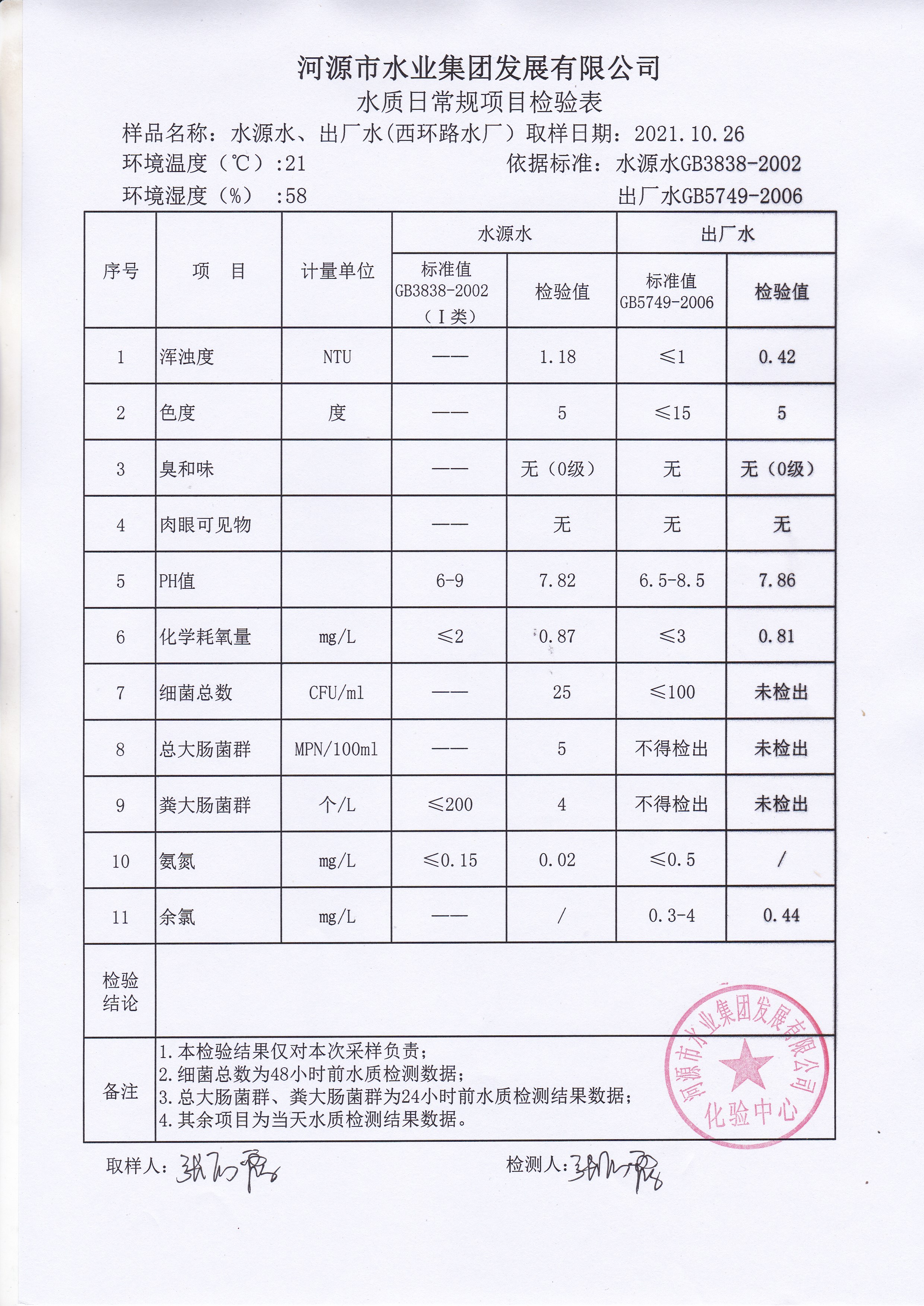 2021年10月26日水質(zhì)檢驗(yàn)報(bào)告