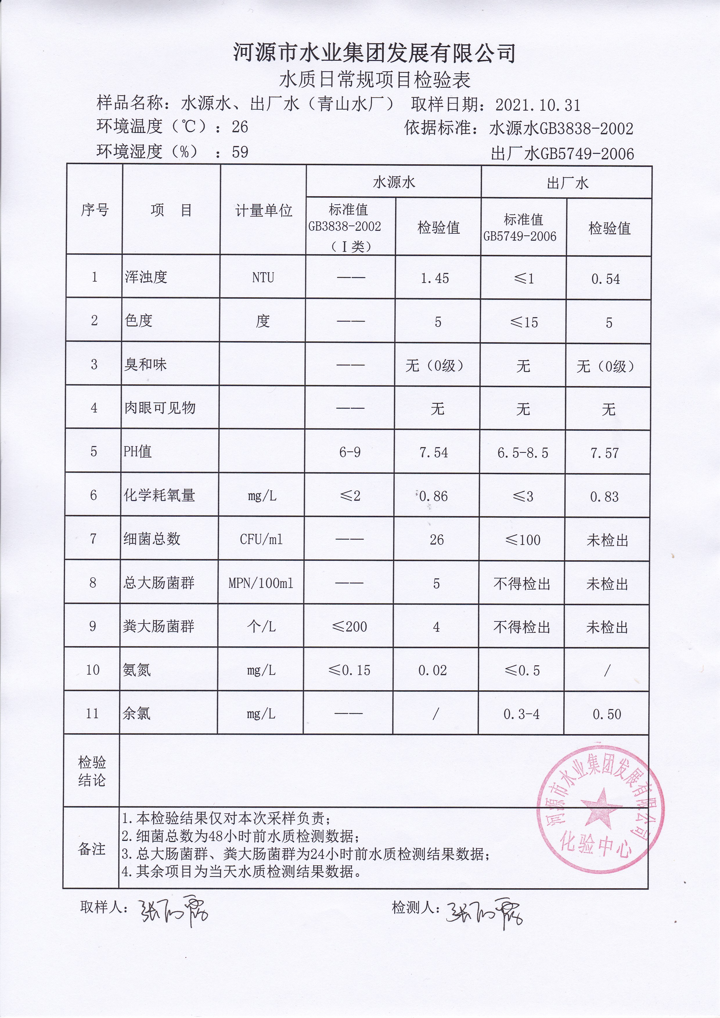 2021年10月31日水質(zhì)檢驗(yàn)報(bào)告