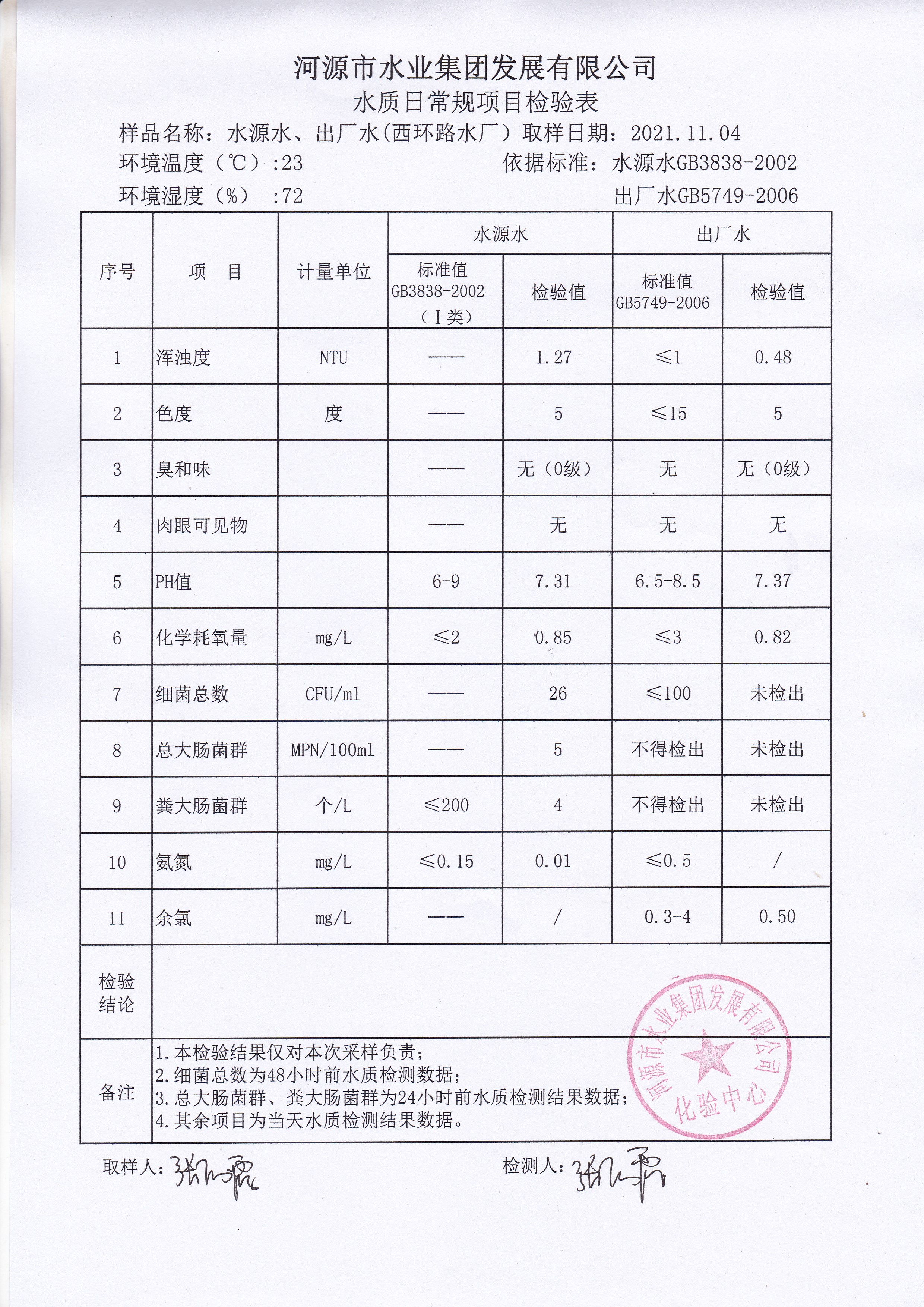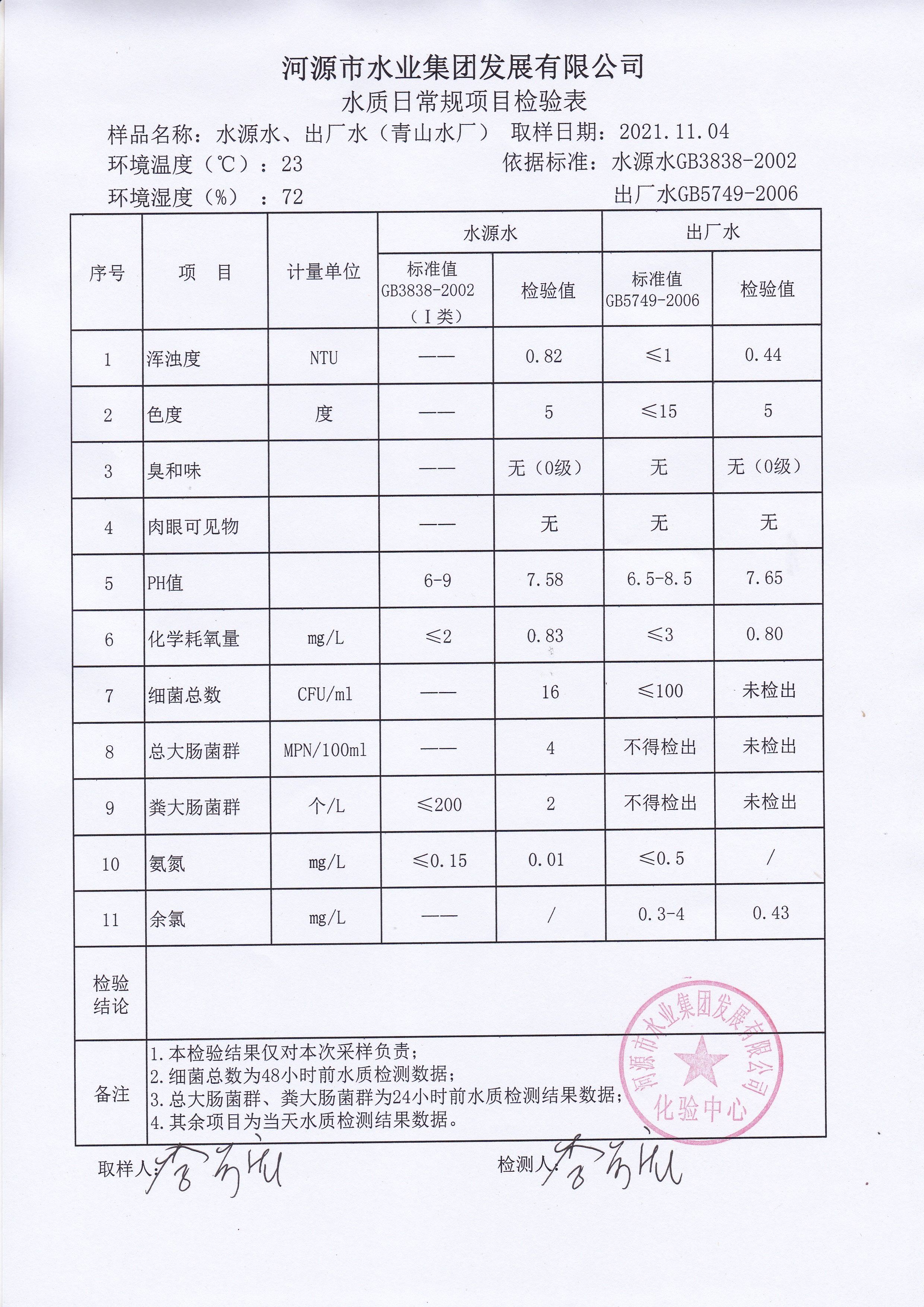 2021年11月4日水質(zhì)檢驗報告